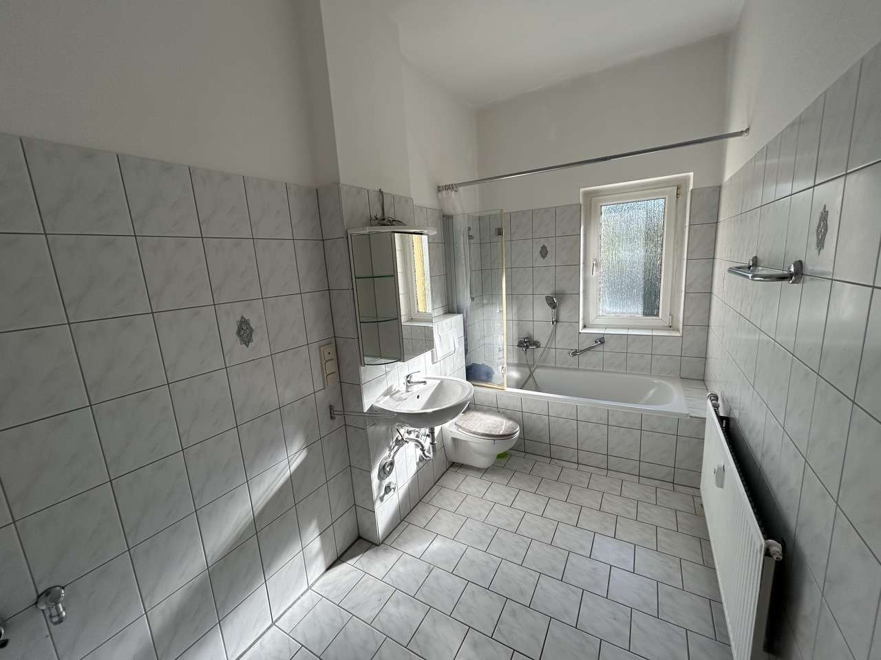 - gefliestes Tageslichtbad mit Wanne, Duschabtrennung und Spiegelschrank
